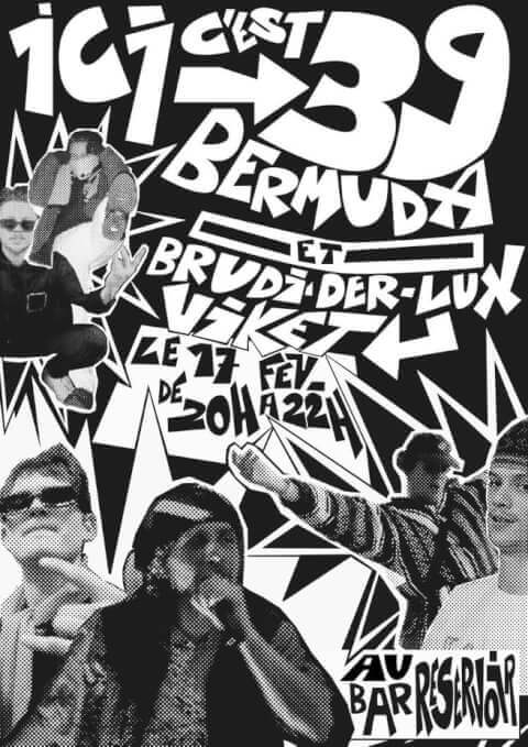 Concert du 39 Bermuda au Reservoir Bar -1ère partie Brudi der Lux & Viket Co-organisateur @lereservoirbar https://www.facebook.com/Le-Reservoir-bar-1169801176526169/ Le 39bermuda est un groupe bruxellois qui mélange les textes et flows aussi techniques que tranchants du mc 39Skut accompagné des instru planantes inspirées des musiques électroniques des années 90, qui viennent droit du cerveau du beat-maker 39Felix. Le tout donne un univers unique 100% fait maison qui ne laissera pas d'autre choix au public que de viber sans arrêt sur un son plus que motivant et rassembleur. https://www.youtube.com/watch?v=ffCaF90la3o... https://www.youtube.com/watch?v=l3HglOdDHs4... Deux artistes Allemand feront 220km en jet depuis Cologne pour venir nous livrer leur show en 1ère partie. Brudi der Lux est un rappeur d'origine Allemande ayant grandi à Bruxelles. Membre et Mc du groupe Zeta Clan, ses influences musicales varient tel qu'on ne peut réellement définir son style de rap. Un mélange de français et d'allemand posé sur le tempo des instru créé par les mains talentueuse de VIKET, son fidèle producteur. https://www.youtube.com/watch?v=ZUQlpR__8s0... https://www.youtube.com/watch?v=IJLDajhXwl8... VENEZ NOMBREUX !