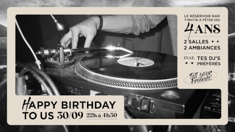 On t’a pas dit ? On a 4 ans ! 🕯️🕯️🕯️🕯️ Le 30 septembre, on remue la terre et le ciel en soufflant nos 4 bougies en votre compagnie ! 🔥🔥🔥 Pour l’occasion, on vous réserve une soirée que vous n’êtes pas prêt.e.s d’oublier, avec une belle brochette de DJs répartis dans 2 salles pour 2 ambiances différentes 🎧🎶 → Les Tropical Djipsies nous feront l’honneur d’un set goût tropical au rez-de-chaussée. → Un line up de DJs de ouf made in Paris vous comblera de ses sons électros dans notre basement. On vous attend de pied ferme pour fêter ça comme il se doit ! 🎂 Passez le mot ! La team Réservoir