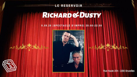 Le Réservoir présente Richard & Dusty., un Spectacle d’improvisation en DUO pas tout-à-fait traditionnel …puisqu’ils se permettent de décrocher et de se moquer d’eux-mêmes Richard se dit « professionnel » et il est un rien « dikke nek » Dusty est « à l’essai » (Richard lui donne sa chance…) exalté et naïf .Serait-il exploité ? Début du spectacle - 20:00 Fin du spectacle - 22:00 Pour respecter les mesures liées au Covid, le nombre de places sera limité à 50 et les réservations permises pour des groupes de maximum 10 personnes. Pour réserver, il suffit d'envoyer un message sur notre page officielle ou part mail et téléphone au 02/376.76.69 - Respecter les règles de distanciation sociale - Port du masque obligatoire pour tout déplacement - Limiter vos déplacements dans l’établissement Prix libre Chapeau à la sortie
