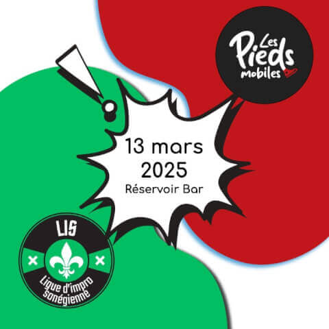 C’est quoi ? Un match d’impro ! Avec quelles équipes ? > La LIS (Ligue d’Impro Sonegienne) > et les Pieds Mobiles Où ça ? Au réservoir Bar, en plein cœur de Bruxelles À quelle heure ? Le spectacle commence à 20h, pour 2 x 45 min. Tu viens ?